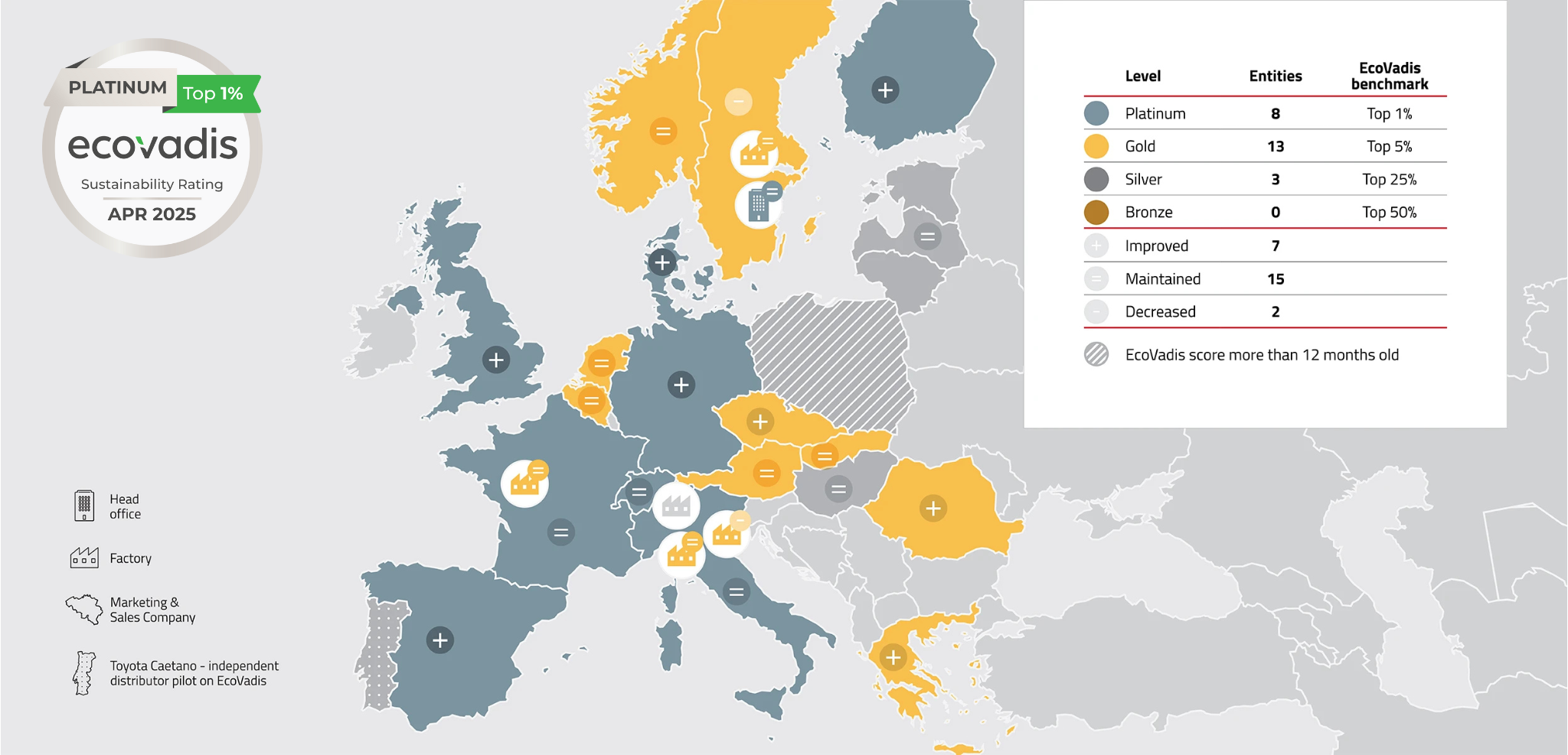 Všechny naše továrny nyní dosáhly zlaté úrovně EcoVadis a 85 % našich obchodních společností je na platinové nebo zlaté úrovni.