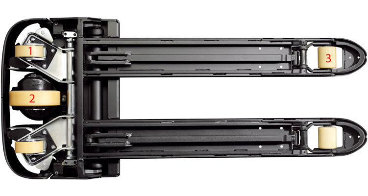 2)Hnané kolo: Protože je hnané kolo umístěno na středu, vozík se nezačne přetáčet, když kolo opět získá přilnavost (např. na mokré podlaze nebo rampě). Pokud je hnané kolo umístěno mimo střed, může se vyskytnout neočekávaný pohyb do stran.